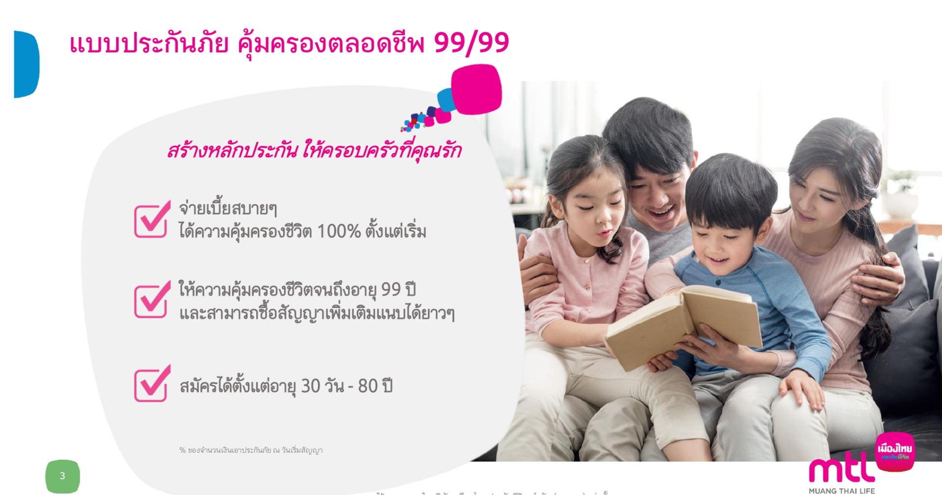 - ให้ความคุ้มครองชีวิตจนถึงอายุ 99 ปี และสามารถซื้อสัญญาเพิ่มเติมแนบได้ยาวๆ